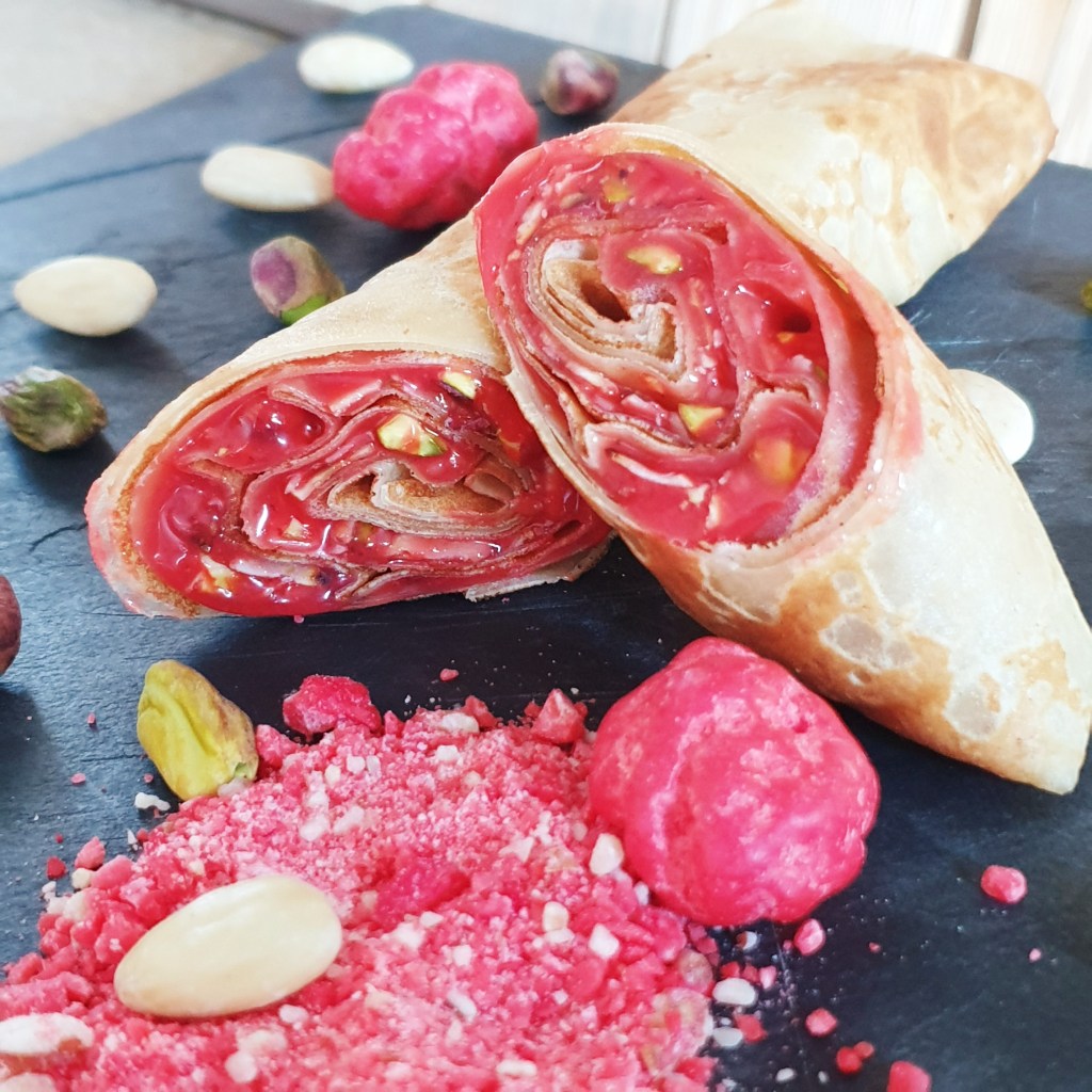 Je vous propose de voyager avec moi grâce à cette crêpe de pure tradition bretonne, tournée à la main et cuite sur un bilig* en fonte, fourrée à une crème de praline rose (une spécialité de la région Lyonnaise). Des amandes torréfiées sont ajoutées pour apporter du croquant et sublimer le goût de la crêpe.